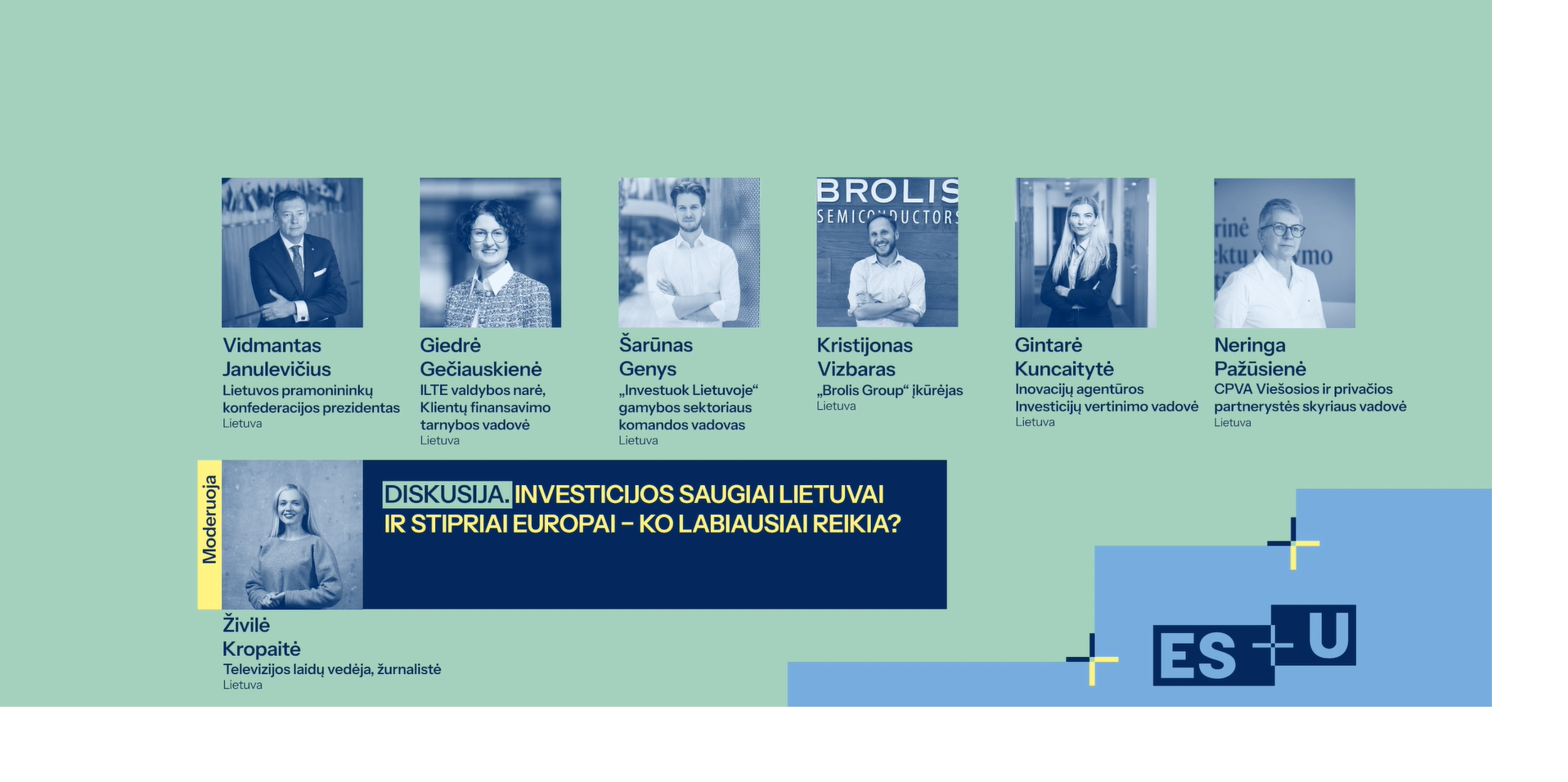 DISKUSIJA. INVESTICIJOS SAUGIAI LIETUVAI IR STIPRIAI EUROPAI – KO LABIAUSIAI REIKIA?Vidmantas Janulevičius (Lietuvos pramonininkų konfederacijos prezidentas), Giedrė Gečiauskienė (ILTE valdybos narė, Klientų finansavimo tarnybos vadovė), Šarūnas Genys („Investuok Lietuvoje“ gamybos sektoriaus komandos vadovas), Kristijonas Vizbaras („Brolis“ bendrakūrėjas), Gintarė Kuncaitytė (Inovacijų agentūros Investicijų vertinimo vadovė), Neringa Pažūsienė (CPVA Viešosios ir privačios partnerystės skyriaus vadovė).